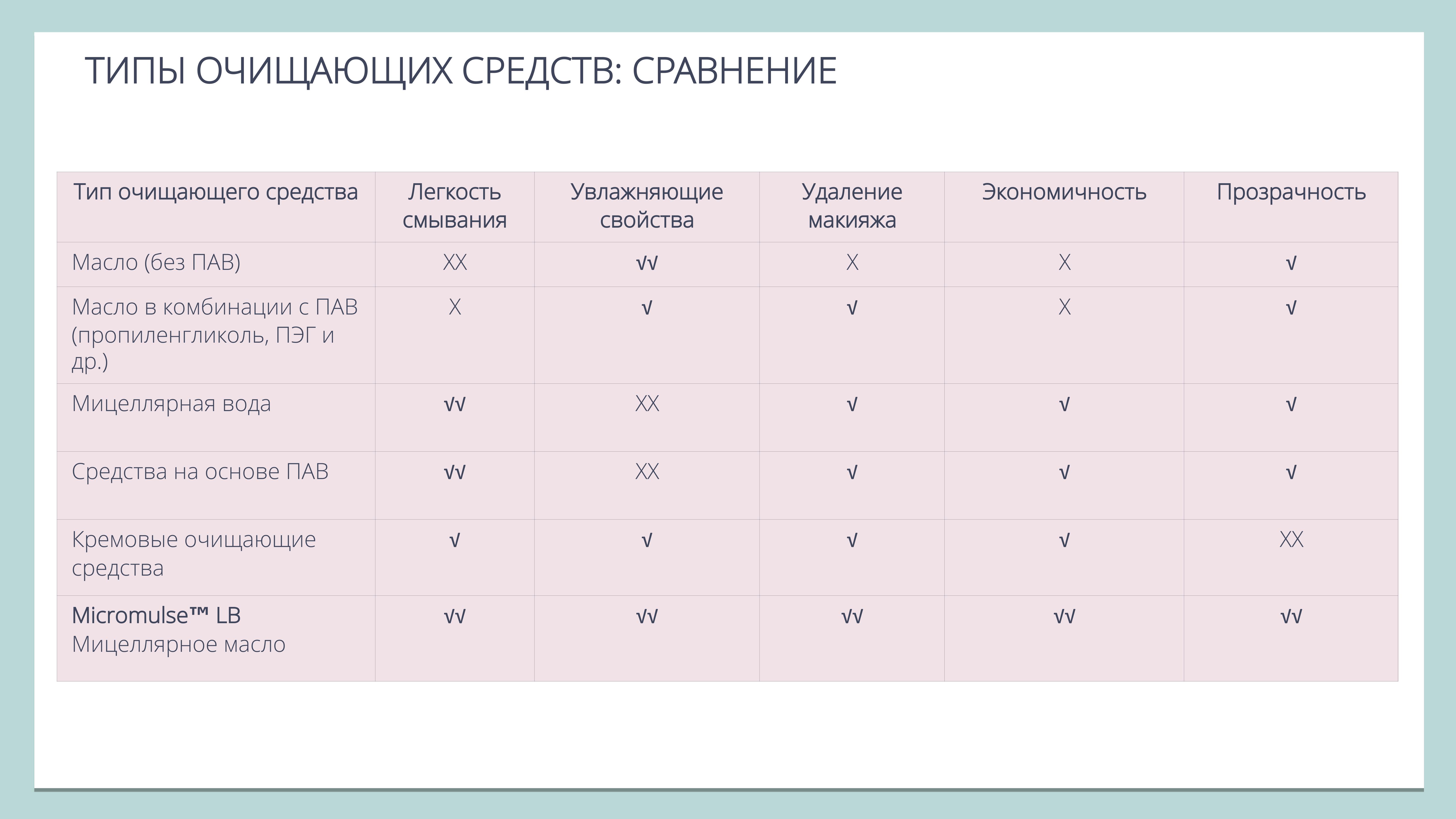 Продукты на основе Micromulse LB имеют высокую очищающую и увлажняющую способность.